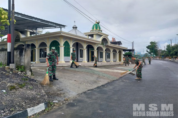 MahesaMediaCenter, Liwa – Ciptakan Lingkungan bersih dan nyaman, Anggota Kodim 0422/LB laksanakan pembersihan masjid Darussalam yang bertempat di Jl.Raden Intan Kec. Balik Bukit Kab. Lampung Barat , Kamis (02/03/2023).