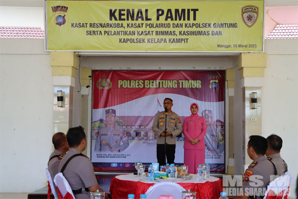 Kepada awak media Kapolres Belitung Timur AKBP Arif Kurniatan, SIK, MM mengatakan “hari ini Polres Belitung Timur melaksanakan Sertijab Kasat Narkoba, Kasat Polairud, dan Kapolsek Gantung serta pelantikan Kasat Binmas, Kapolsek Kelapa Kampit, dan Kasi Humas.
