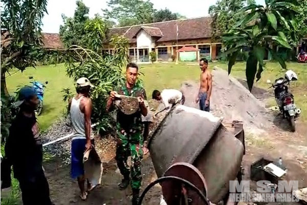 Babinsa Serda Zumaidi melaksanakan kerja bakti bersama warga melakukan pengecoran bangunan gedung perpustakaan di samping kantor Balai Desa Nalumsari, Kecamatan Nalumsari, Kabupaten Jepara. Kamis (9/3/2023).
