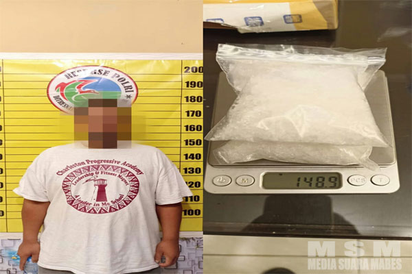 Tersangka SP diamankan karena membawa 2 bungkus klip plastik transparan yang diduga sabu seberat 148,9 Gram.