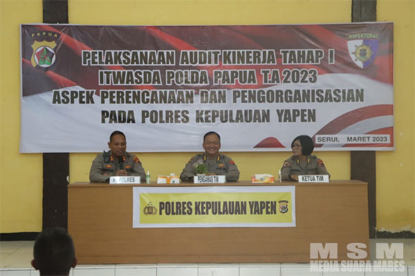 MahesaMediaCenter, Yapen – Inspektorat Pengawasan Daerah (Itwasda) Polda Papua menggelar kegiatan audit kinerja Tahap I Itwasda Polda Papua T.A 2023 Aspek Perencanaan dan Pengorganisasian Pada Polres Kepulauan Yapen. bertempat di gedung mambora Polres Kepulauan Yapen.Kamis (30/3/2023).