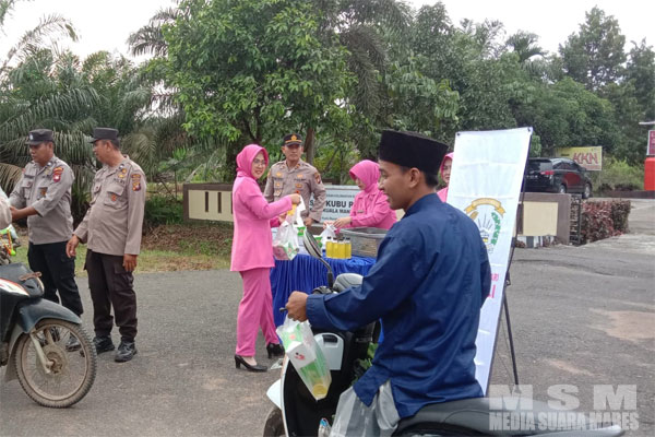 Sebanyak 70 paket takjil untuk berbuka puasa dibagi-bagikan oleh Kapolsek Kuala mandor B,Dan didampingi Ketua Bhayangkari Ranting Polsek Kuala Mandor B,