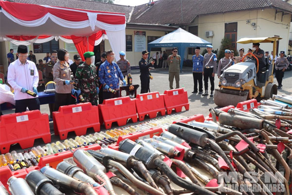Usai pelaksanaan Apel Gelar Pasukan OKC 2023, dilakukan pemusnahan barang bukti minuman keras dan knalpot tidak standar hasil dari Kegiatan Rutin Yang Ditingkatkan (KRYD) di wilayah hukum Polres Magelang Kota.
