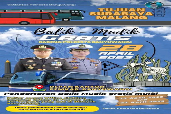 “Polresta Banyuwangi mengadakan balik mudik gratis dengan tujuan surabaya dan malang,” Kata Kapolresta Banyuwangi Melalui Kasat Lalu Lintas, Kompol Randy Asdar S. kom. S. I. K., Senin (24/04/2023).