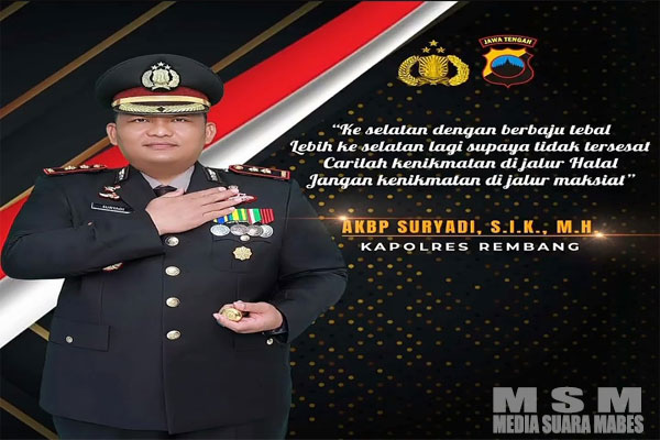 AKBP Suryadi Kini Mengemban tugas dan tanggung jawab Menjaga Kondusifitas di Wilayah hukum Polres Rembang . AKBP Suryadi , S.I.K . M.H. Perlu di Ketahui Beliau adalah Lulusan Akademi Kepolisian Tahun 2002 dan Berpengalaman dalam Bidang Reserse . ( M C S )