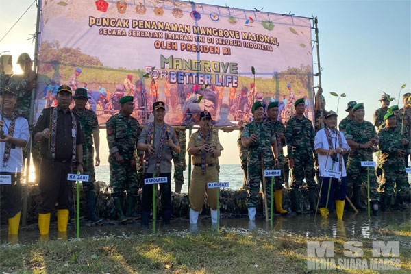 MahesaMediaCenter, Jepara — Kegiatan Puncak Penanaman Mangrove Nasional yang digelar serentak se-Indonesia pada Senin (15/5/2023) sore. Dipusatkan di Pantai Bulakbaru, Kecamatan Kedung, Kabupaten Jepara. Agenda tersebut tak hanya diikuti jajaran Kodim 0719/Jepara, namun juga dari Polres dan jajaran Pemerintah Kabupaten Jepara.