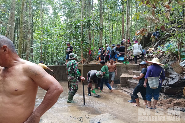MahesaMediaCenter, Bengkayang – Babinsa Koramil1202- 09/Jagoi Babang Serda januardi gotong royong bersama warga membersihkan saluran air bersih yang tersumbat oleh bebatuan dan dahan pohon di Dsn.Jagoi Babang, Kec.Jagoi babang kab.Bengkayang. Senin (29/05/2023).