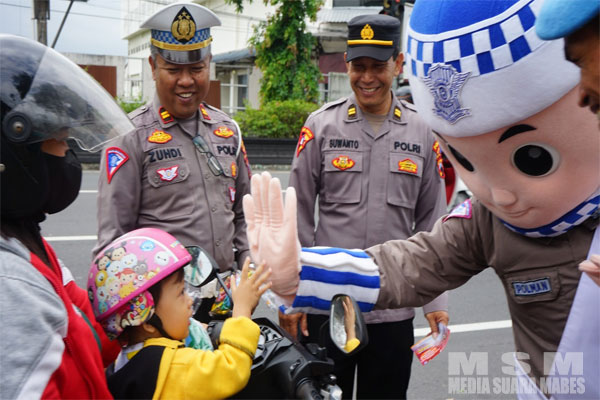 Ada juga petugas Satlantas yang mengenakan kostum Boneka “POLMAN” dengan memegang tulisan ajakan tertib berlalu lintas.