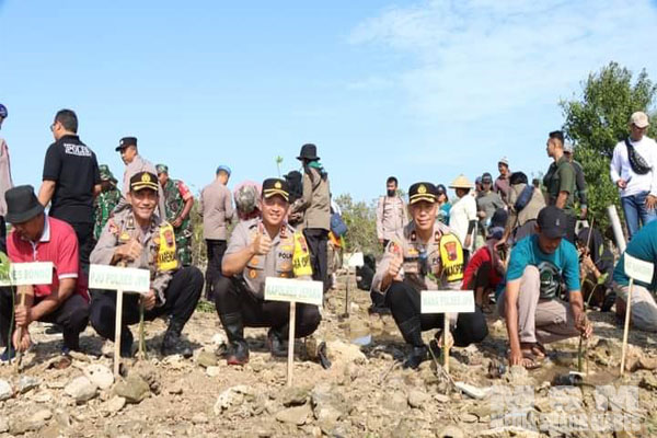 MahesaMediaCenter, Jepara – Kapolres Jepara AKBP Wahyu Nugroho Setyawan menghadiri puncak penanaman 1.000 pohon mangrove bersama warga masyarakat di kawasan Pantai Kropak, Desa Bondo, Kecamatan Bangsri, Kabupaten Jepara, Jumat (21/7/2023).