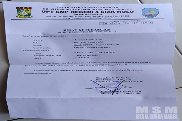 Sudah mendapatkan surat keterangan Juara satu umum dari semua siswa /siswi sekolah UPT SMP Negeri 4 SiakHulu Kampar, yang ditandatangani langsung kepala sekolah UPT SMP SiakHulu Kampar. Mohammad Hujani S. Pd. Tanggal 21 Juli 2023.