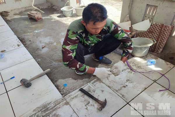 Dari awal pembangunan hingga saat ini pada tahap pemasangan keramik lantai dan plester dinding, anggota Satgas dan masyarakat setempat kompak saling bekerjasama, agar hasil yang dicapai bisa maksimal.