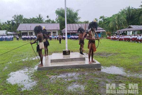 MahesaMediaCenter, Waropen – Ada yang berbeda pada pelaksanaan Upacara Hari Ulang Tahun Republik Indonesia ke-78 tahun 2023 bertempat di Lapangan SMP Negeri Koweda, Distrik Masirei, Kabupaten Waropen Provinsi Papua, Kamis (17/8/2023).