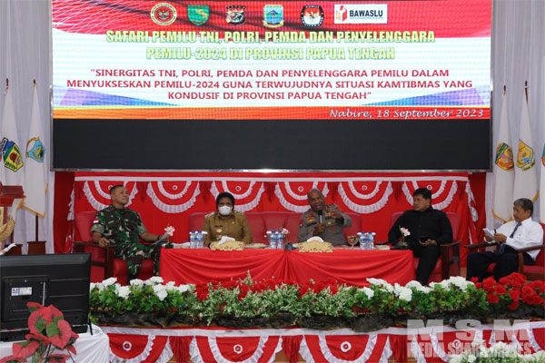 MahesaMediaCenter, Nabire – Kepala Kepolisian Daerah Papua Irjen Pol Mathius D. Fakhiri, S.I.K, menghadiri kegiatan Safari Pemilu bertempat di Aula Pemda Kabupaten Nabire Provinsi Papua Tengah, Senin (18/9/2023).