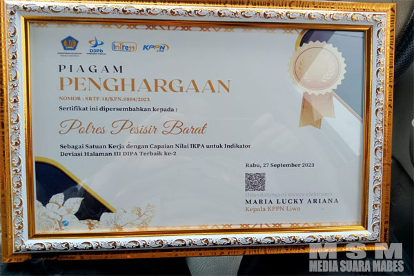 MahesaMediaCenter, Pesisir Barat – Polres Pesisir Barat mendapatkan penghargaan terbaik ke-2 sebagai satuan kerja dengan capaian nilai IKPA (Indikator Kinerja Pelaksanaan Anggaran) untuk indikator Deviasi halaman III DIPA yang di berikan oleh KPPN Liwa, Hari Rabu (27/09/23).