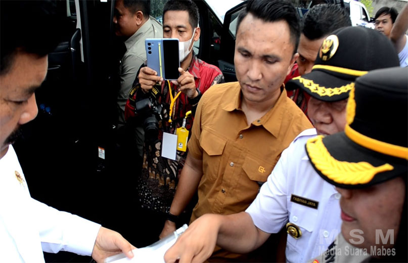 MahesaMediaCenter, Pesawaran – Kepala Desa Taman Sari Kecamatan Gedongtataan Kabupaten Pesawaran,Fabian Jaya didampingi Safrudin Tanjung perwakilan dari masyarakat Gedongtataan ,menyerahkan secara langsung bukti dokumen prihal lahan perkebunan karet milik masyarakat yang ada di Tanjung Kemala yang diklaim milik PTPN 7 ,kepada Menteri Agraria dan Tata Ruang/Kepala Badan Pertanahan Nasional (ATR/BPN) Hadi Tjahjanto .