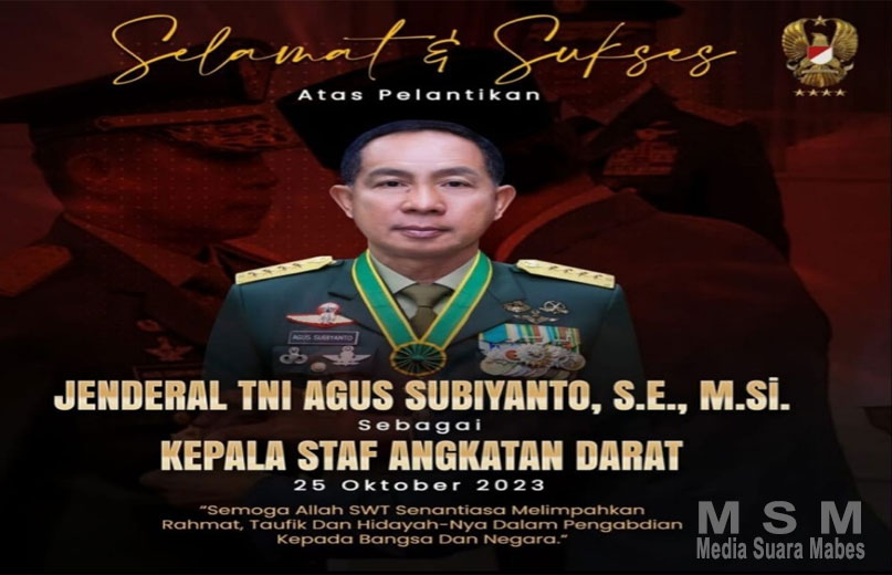 MahesaMediaCenter, Jakarta – Jajaran Media Suara Mabes Pusat mengucapkan, selamat atas dilantiknya Jenderal Agus Subiyanto, menjadi Kepala Staf Angkatan Darat (KSAD) menggantikan Jenderal Dudung Abdurachman di Istana Negara, Jakarta, Rabu (25/10/23)