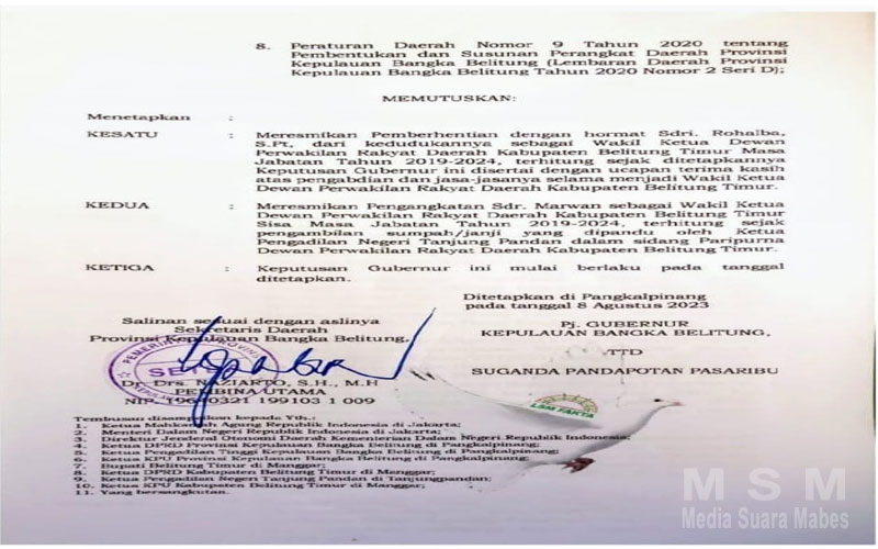 Ketua LSM FAKTA Belitung Timur, Ade kelana mengatakan kepada MediasuaraMabes.Com. “Dengan terbitnya surat Mahkamah Partai PKS tersebut berarti memperkuat Surat Keputusan DPW PKS nomor : 432/SKEP/DPP-PKS/2023 tertanggal 7 Juni 2023 tentang Pergantian Antar Waktu Wakil Ketua 1 Dewan Perwakilan Rakyat Daerah Kabupaten Belitung Timur Propinsi Bangka Belitung dari Partai PKS, yang semula di jabat Rohalba di gantikan oleh Marwan yang berlaku sejak tanggal 7 juni 2023.”Jelas Ade Kelana.
