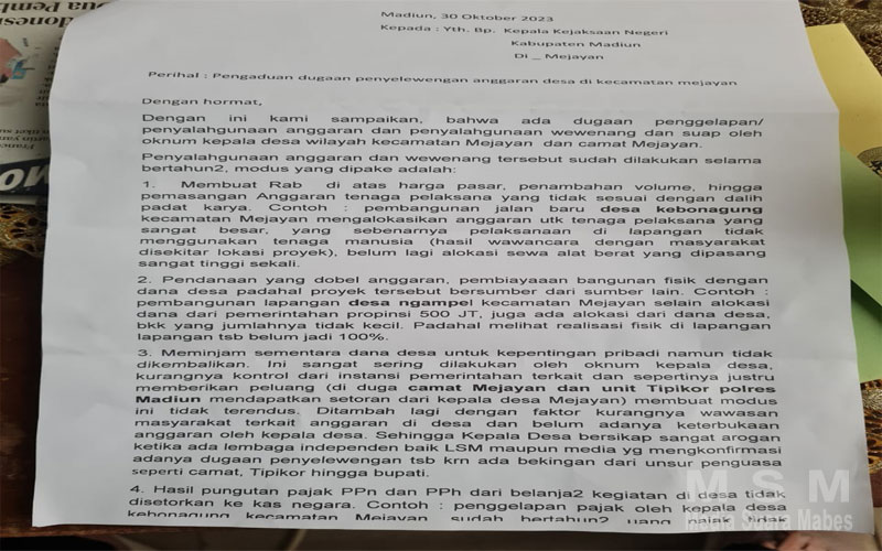 Pada isi surat yang beredar disebutkan bahwa dicurigai adanya ketidaktransparanan pada beberapa item program yang dilaksanakan Di Desa itu sehingga menggerakkan perwakilan warga untuk melakukan pengaduan kepada Dinas PMD Kabupaten Madiun Kejaksaan Negeri Kabupaten madiun Ketua DPRD hingga Kapolda jawa timur.