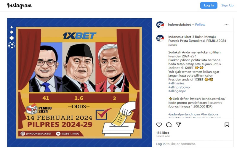 Unggahan itu mengajak masyarakat menempatkan taruhan pada capres yang diprediksi menang dalam Pilpres 2024. “Yuk ajak teman-teman kalian supaya jangan lupa vote pilihan calon presiden anda di 1XBET,” tulis unggahan itu.