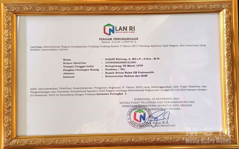 MahesaMediaCenter, Sumedang – Kepala Rumah Tahanan Negara (Rutan) Kelas IIB Prabumulih, Zulkifli Bintang berhasil meraih Prestasi Istimewa Peringkat I pada Pelatihan Kepemimpinan Pengawas Angkatan IV Tahun 2023 di Pusat Pelatihan dan Pengembangan dan Pemetaan Kompetensi Aparatur Sipil Negara Lembaga Admistrasi Negara, Kamis (23/11/2023).