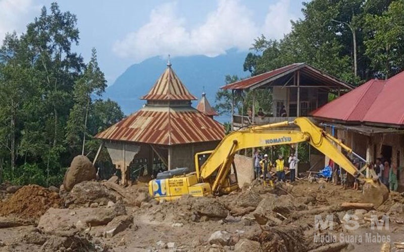 Selain itu, material banjir bandang juga menimbun lapangan bola voli dan menutupi akses jalan dengan ketinggian mencapai 1-2 meter dan panjang 100 meter, sehingga akses jalan tidak bisa dilewati kendaraan.