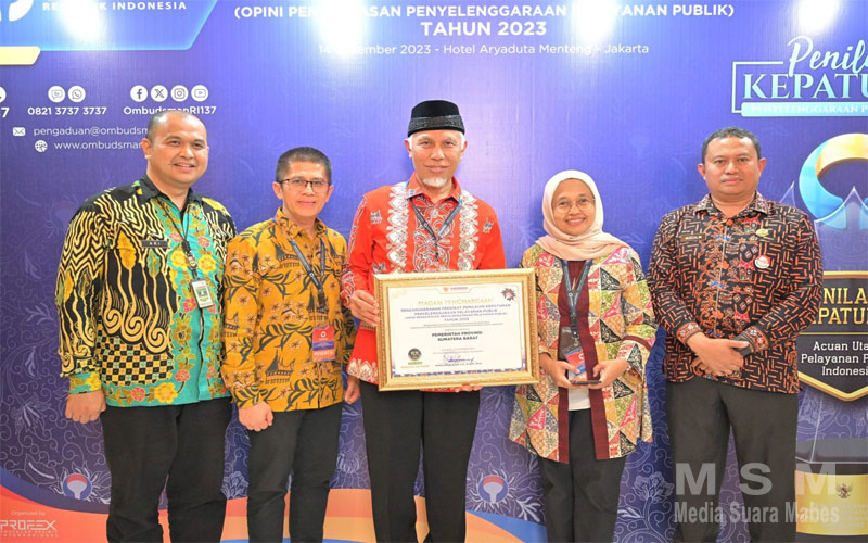 MahesaMediaCenter, Jakarta – Pemerintah Provinsi Sumatera Barat (Pemprov Sumbar), menembus jajaran enam besar provinsi dengan Penilaian Kepatuhan Penyelenggaraan Pelayanan Publik tertinggi tahun 2023. Penghargaan atas capaian tersebut diterima Gubernur Sumbar, Mahyeldi Ansharullah, dari Ombudsman RI di Aryaduta Hotel, Jakarta Pusat, Kamis (14/12/2023).