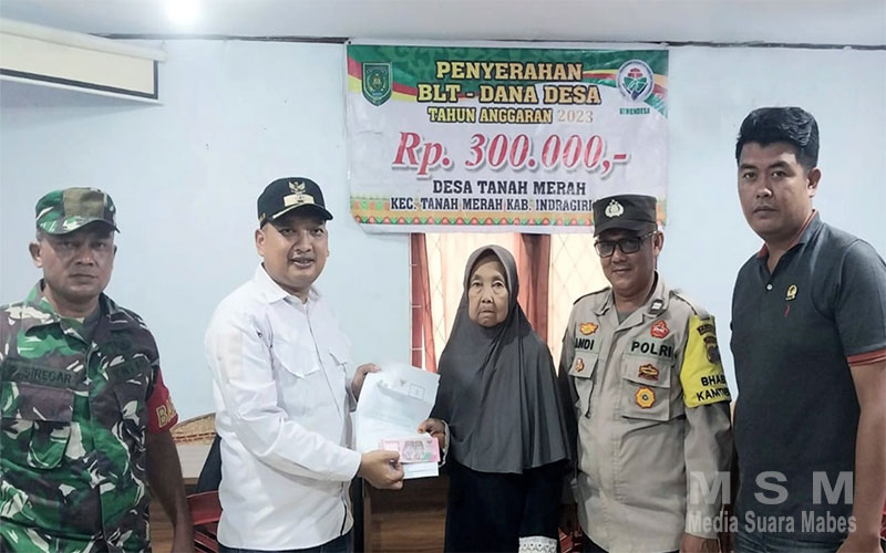 MahesaMediaCenter, Indragiri Hilir – Bhabinkamtibmas Desa Tanah Merah yang bertugas di Kecamatan Tanah Merah, turut aktif dalam menjalankan tugasnya dengan melaksanakan kegiatan pengamanan pada penyerahan dana Bantuan Langsung Tunai (BLT) sejumlah 300 ribu rupiah untuk tahun anggaran 2023. Kegiatan tersebut berlangsung di Kantor Desa Tanah Merah.