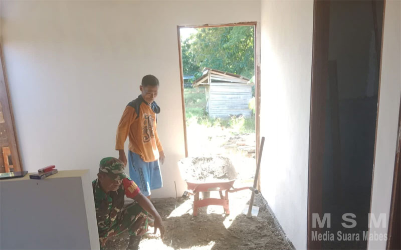 MahesaMediaCenter, Napan ~ Untuk membangun dan memperkuat kebersamaan dengan warga masyarakat binaan, Babinsa Koramil 1705/02 Napan (Sertu M.Yusuf) melaksanakan kegiatan karya bhakti membantu pemasangan keramik rumah milik Bapak Lukman warga binaannya di Kampung Biha, Distrik Makimi, Kabupaten Nabire, Provinsi Papua Tengah.