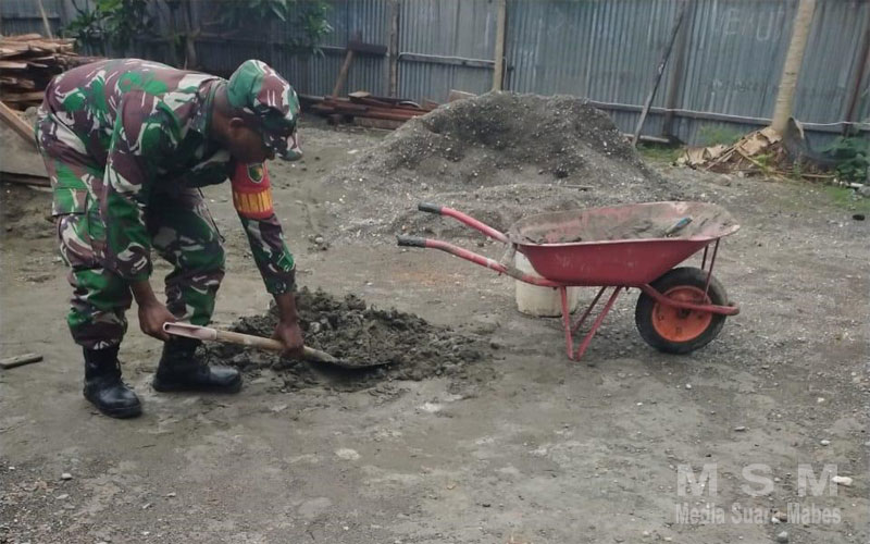 MahesaMediaCenter, Nabire ~ Salah satu ciri seorang Babinsa adalah,harus selalu rendah hati dan ringan tangan. Hal ini di miliki oleh Babinsa Koramil 1705-01/Nabire (Serda Pikey) yang sedang membantu warga binaan dalam perehapan tempat tinggal Bapak Hans Edowi di Kampung Kali harapan Distrik Nabire Kabupaten Nabire Propinsi Papua Tengah.