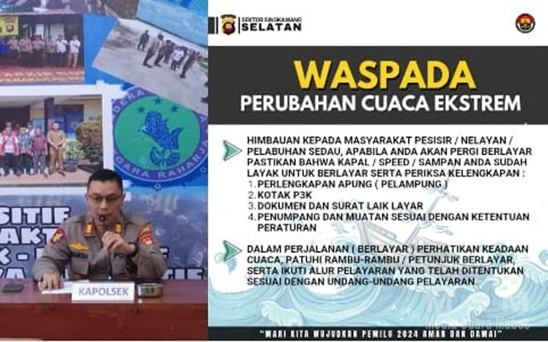 Dalam menghadapi cuaca ekstrim, Kapolsek Singkawang Selatan AKP Sumangap P Simamora SH. MH., melalui akun resmi Instagram Kapolsek Singkawang Selatan mengeluarkan himbauan kepada masyarakat pesisir/nelayan/pelabuhan Sedau di wilayah kecamatan Singkawang Selatan, Kota Singkawang, Kalimantan Barat. Jum’at, 5/Januari/2024.