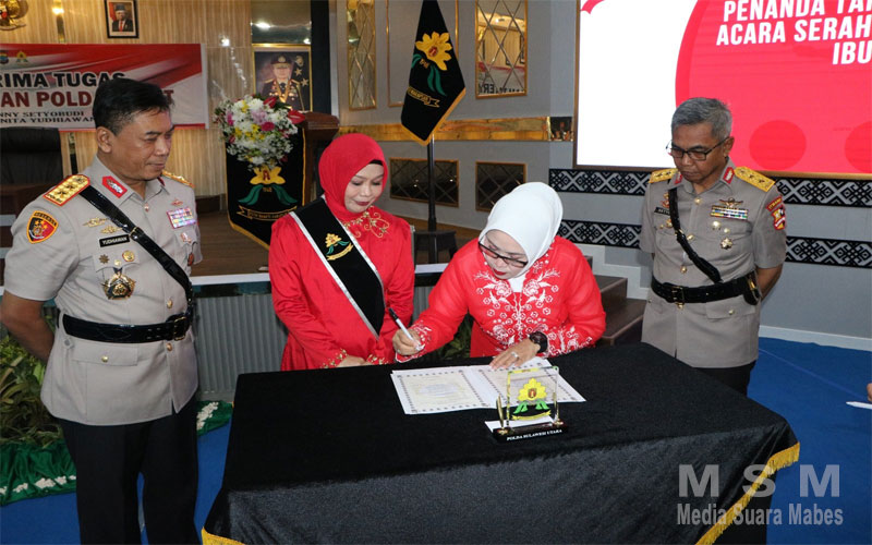 Setelah itu, Kapolda Sulut Irjen Pol Yudhiawan memakaikan selempang dan menyerahkan lencana Esthi Bhakti Warapsari kepada Ny. Yunita Yudhiawan. Dilanjutkan penandatanganan berita acara serah terima.