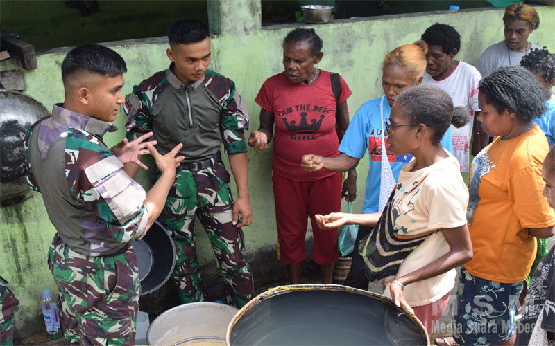 Diungkapkan Danpos Sawiyatami Lettu Inf Zulkifli Sirait bersama anggotanya, mengajarkan warga cara membuat tempe kepada warga Kampung Sawiyatami.