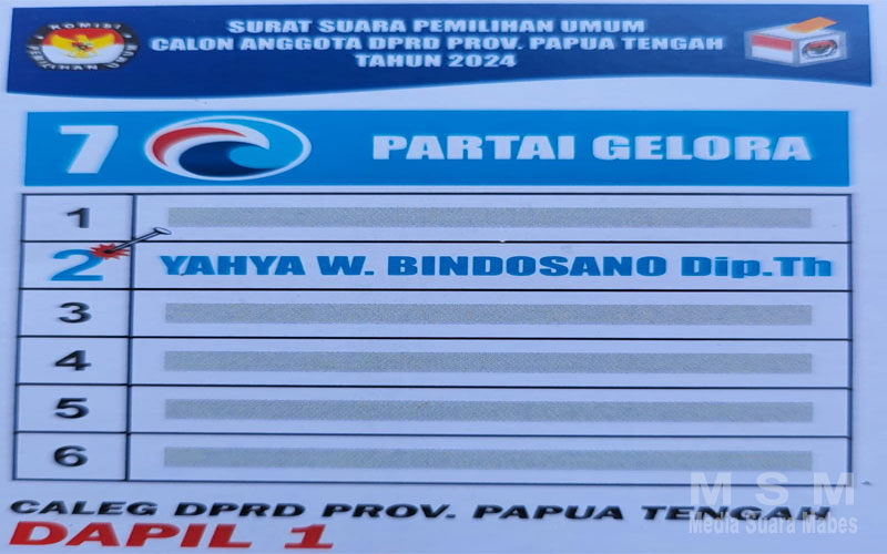 MahesaMediaCenter, Nabire – Sosok Yahya W. Bindosano dari partai gelora dalam hal ini maju dari dapil 1 (satu) Provinsi papua Tengah kabupaten Nabire nomor urut partai no: 7 dan nomor calon legislatif (Caleg) nomor 2 (dua) yang juga merupakan seorang putra Orang Asli Papua (OAP) berbakat dan memiliki pemahaman mendalam tentang kepentingan Rakyat menengah kebawa kususnya kepentingan masyarakat adat Papua.