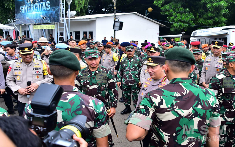 MahesaMediaCenter, Jakarta – Panglima TNI Jenderal TNI Agus Subiyanto bersama Kapolri Jenderal Pol Listyo Sigit Prabowo meninjau dan memastikan kesiapan aparat TNI-Polri yang tergabung dalam Operasi Mantap Brata 2024, bertempat di Pos Komando Taktis (Poskotis) kawasan Silang Monas, Jakarta Pusat, Rabu (14/2/2024).