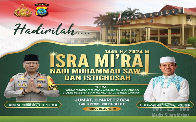 MahesaMediaCenter, Sulut – Polda Sulawesi Utara akan menggelar peringatan Isra Mikraj Nabi Muhammad SAW 1445 H dan Istighosah, di Halaman Presisi Polda Sulut, pada hari Jumat, 8 Maret 2024 pukul 18.30 Wita.