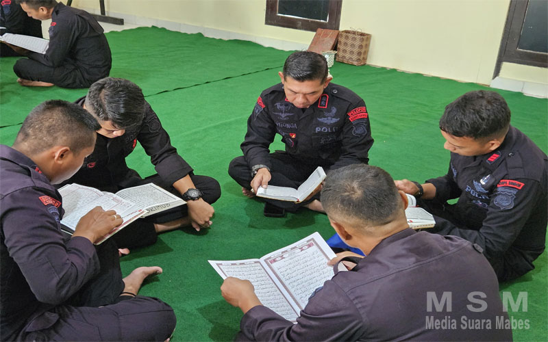 MahesaMediaCenter, Gorontalo – Personel Batalyon A Pelopor Satbrimob Polda Gorontalo menggelar program tadarus Al-qur’an sebelum memulai aktivitas selama bulan suci Ramadhan 1445 Hijriah. Tadarus Al-qur’an rutin dilaksanakan setiap pagi usai apel di lapangan obro markoto Mako Batalyon A Pelopor Satbrimob Polda Gorontalo, seperti yang berlangsung Jum’at (15/3) pagi di Balai Pelopor Batalyon A Satbrimob Polda Gorontalo.