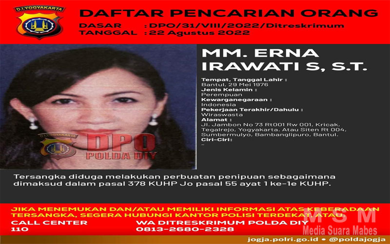 MahesaMediaCenter, Yogyakarta – Buron Polda DIY, perempuan asal Tegalrejo, Kota Jogja, bernama MM. Erna Irawati S, S.T. Melakukan kasus penipuan.