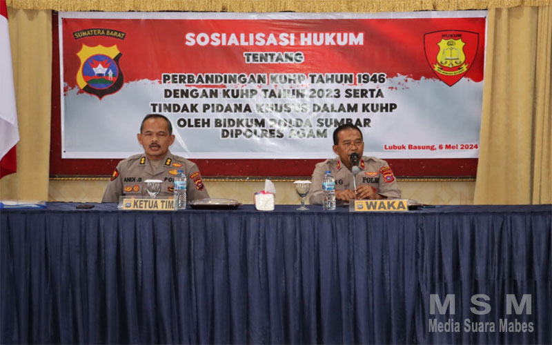 Kegiatan sosialisasi hukum tersebut digelar, bertujuan untuk meningkatkan kemampuan dan sumber daya personil Polres Agam tentang KUHP tahun 2023 yang akan diaplikasikan pada tahun 2026 nanti.