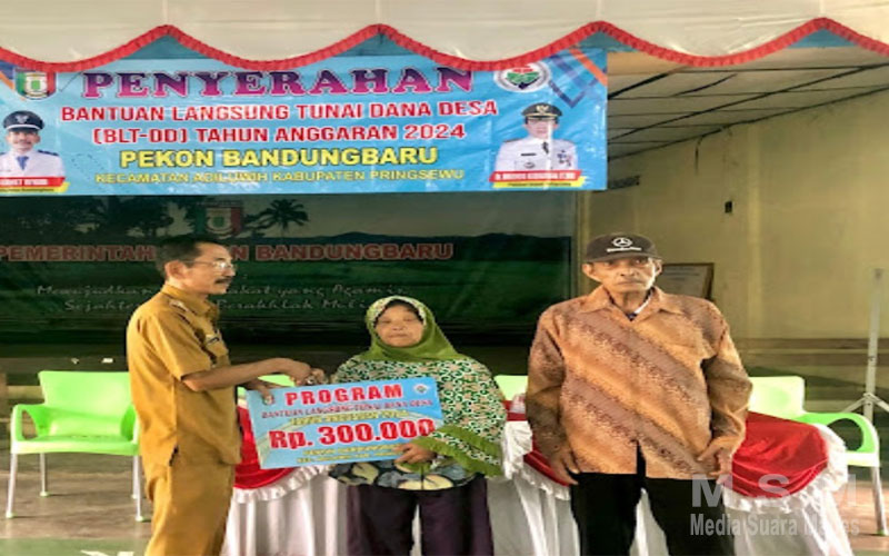 MahesaMediaCenter, Pringsewu – Bantuan Langsung Tunai di berikan secara simbolis oleh Kepala Pekon Bandung baru Slamet Riyadi kepada warga penerima bantuan di Aula Pekon Selasa 14 /05/24.
