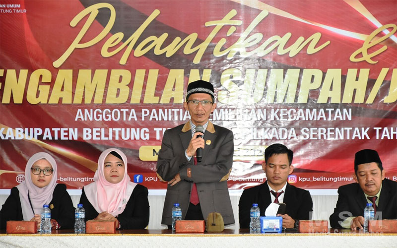 MahesaMediaCenter, Beltim – Ketua Komisi Pemilihan Umum (KPU) Kabupaten Belitung Timur, Marwansyah melantik dan mengambil sumpah 35 orang anggota Panitia Pemilihan Kecamatan (PPK) se-Kabupaten Beltim di Rumah Makan Fega Manggar, Kamis (16/05/24). Setengah dari anggota PPK pada Pemilihan Kepala Daerah Serentak ini merupakan wajah baru.