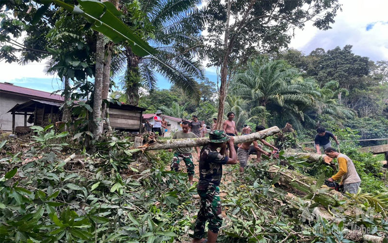 MahesaMediaCenter, Sanggau – Serda Surianto anggota Satgas TMMD 120 Kodim 1204 / Sanggau bersama 2 orang anggota dengan tanggap membantu warga Desa Peret Kecamatan Beduai Kabupaten Sanggau yang sedang menebang pohon.Sabtu (18/05/2024)