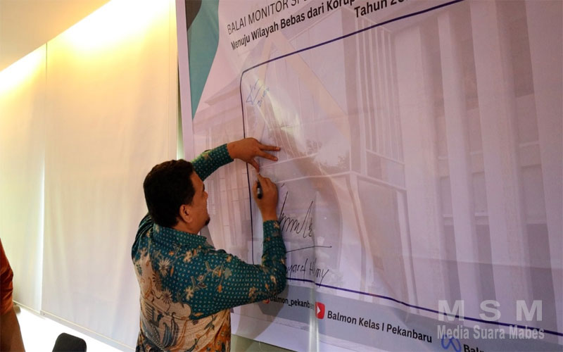 Di akhir acara, seluruh peserta menandatangani spanduk anti-korupsi sebagai bentuk komitmen bersama dalam mewujudkan wilayah bebas korupsi di Balmon Pekanbaru.