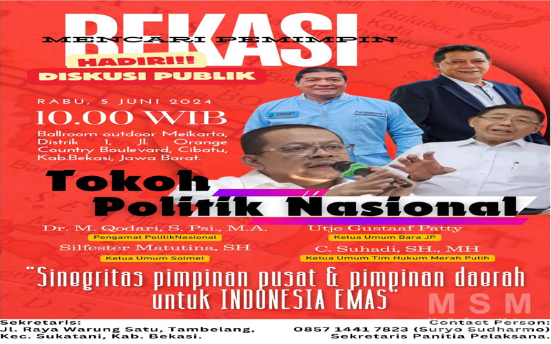 MahesaMediaCenter, Bekasi Jabar – Acara Diskusi Publik dengan tema “Mencari Pemimpin Bekasi” yang akan diadakan pada 5 Juni 2024 di Distric 1 Maikarta telah menarik perhatian publik.