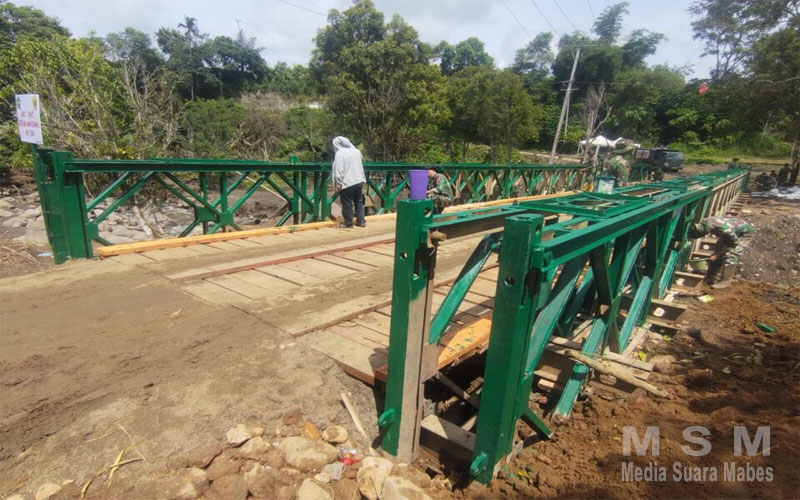 “Sebanyak 1 SST personel Prajurit Yonzikon 12/KJ Menzikon/CRK dengan asitensi dari Pusat Zeni Angkatan Darat (Pusziad) diturunkan untuk membangun jembatan Bailey sejumlah 9 petak type 2-1 guna akses penyaluran ke lokasi bantuan kemanusiaan tersebut, ” tutur Dandim.