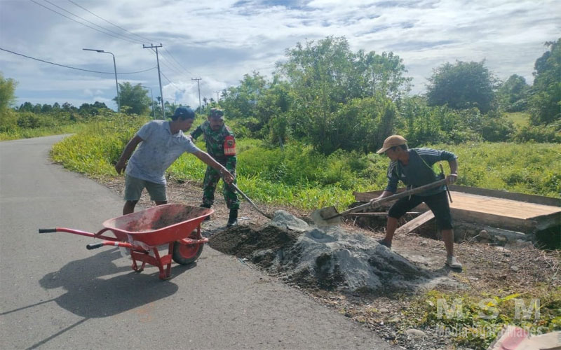 Pembangunan Jembatan tersebut masih dalam tahap pengecoran, hal ini disampaikan Babinsa pada saat melaksanakan pemantauan wilayah dengan ikut terjun langsung membantu warga yang sedang berkerja sekaligus untuk mempermudah pekerjaan Banbinsa juga ikut memberikan semangat agar pekerjaan tidak terasa berat.