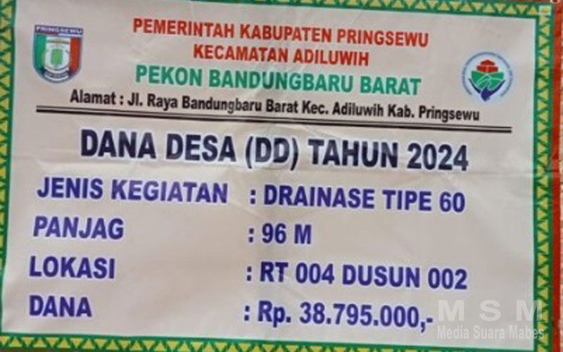 MahesaMediaCenter, Pringsewu – Pembangunan drainase Dana Desa (DD) tahap pertama tahun anggaran 2024, Pekon Bandung Baru Barat, Kecamatan Adiluwih Kabupaten Pringsewu yang dikerjakan dengan cara swakelola, Senin (27/5/24).