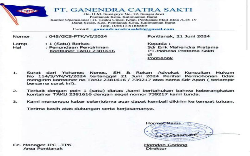 “Kami beritahukan bahwa keberangkatan kontainer TAKU 2381616 dengan segel nomor 7392217 kami tunda,” kata Hamdan Godang, Direktur PT Ganendra Catra Sakti, dalam surat tertulisnya.