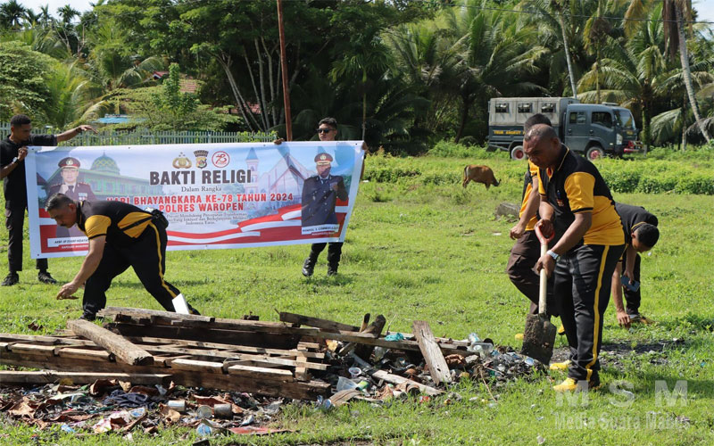 MahesaMediaCenter, Waropen – Kepala Kepolisian Resor Waropen AKBP. Iip Syarif Hidayat, S.H., pimpin langsung kegiatan Bakti Sosial Religi dalam rangka Hari Bhayangkara Ke 78 Tahun 2024 di 2 Tempat Ibadah di Kabupaten Waropen, Sabtu (22/06/2024).