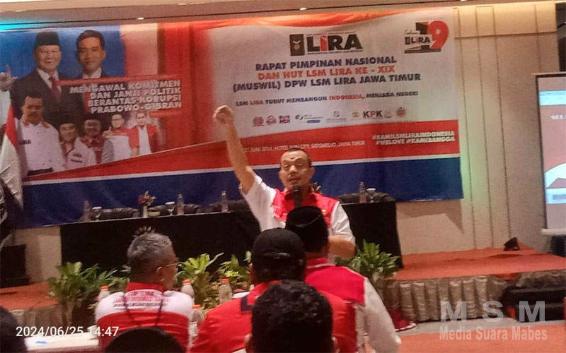 MahesaMediaCenter, Surabaya – Dewan Pimpinan Pusat (DPP) Lumbung Informasi Rakyat( LIRA) menggelar Rapat Pimpinan Nasional (Rapimnas), memperingati HUT LSM LIRA ke-19 dan sekaligus dirangkaikan dengan Musyawarah Wilayah (Muswil) DPW LSM LIRA Jawa Timur yang sekaligus digelar Seminar dan Pelatihan Anti Korupsi Untuk Mengawal Komitmrn dan Janji Politkk Berantas Korupsi Prabowo-Gibran di Hotel Sun City Sidoarjo Provinsi Jawa Timur (26/6/2024).