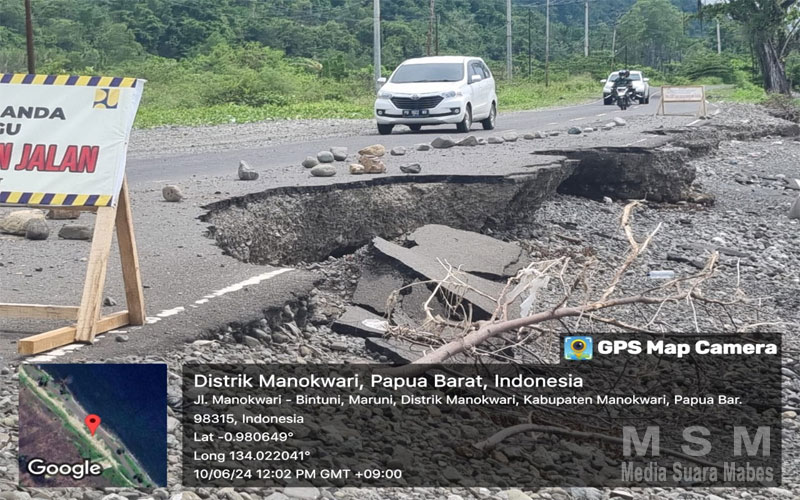 MahesaMediaCenter, Manokwari – Ruas jalan Nasional Manokwari- Bintuni rusak dan mengancam keselamatan pengguna jalan.